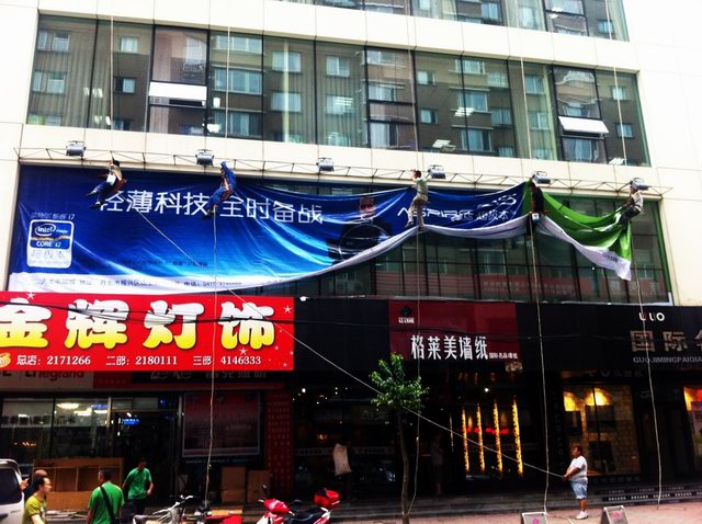 丹東地區(qū)安裝制作樓體廣告噴繪布 加厚布 高空安裝,網(wǎng)格布